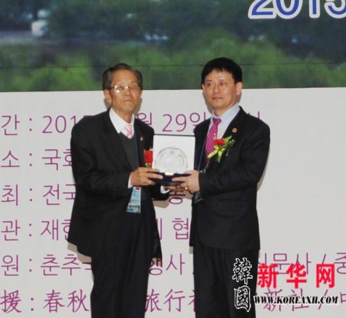 首尔永登浦归韩同胞敬老堂会长朴灵哲(左)代表敬老堂在大会上向全国韩籍华人总联合会总会长曹明权(右)赠送感谢牌,感谢曹明权总会长多年来长期坚持对同胞敬老堂的关心、后援和支持。