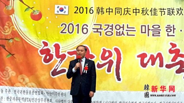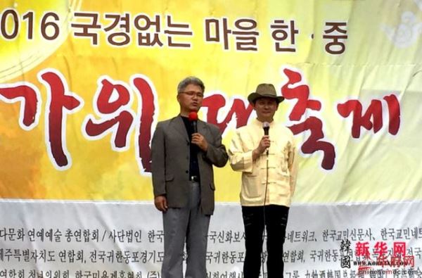 韩国全国韩籍华人总联合会总会长兼韩国新华报社社长曹明权、韩国安山市移住民代表朴天共同分别用中国语和韩国语宣布联欢大会开幕词。