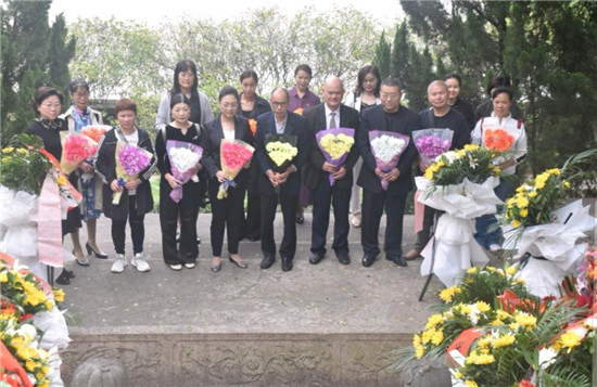 图为助力武术入奥(阿根廷)推广大使、阿根廷福清同乡会会长陈世金(中)带领大家向严复陵墓献花