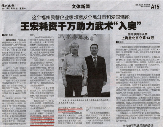 2017年,我在福州晚报上看到,助力武术入奥的理论基础来自严复,兴奋之余我通过朋友联系上助力武术入奥发起人王宏”。