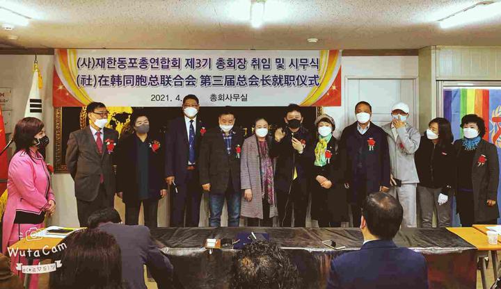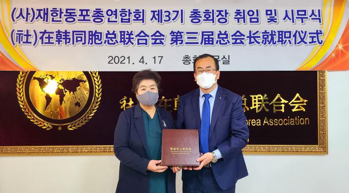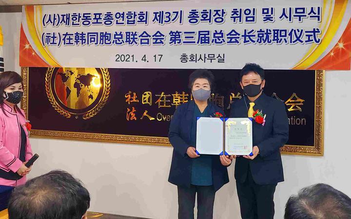 经社团法人在韩同胞总联合会理事长金淑子提名,经总联合会理事会和会长团会议选举,韩国新华报社社长曹明权当选社团法人在韩同胞总联合会第三届总会长。并于2021年4月17日,在首尔大林洞总联合会办公室举行了就职典礼仪式。
