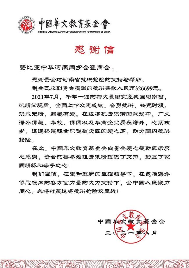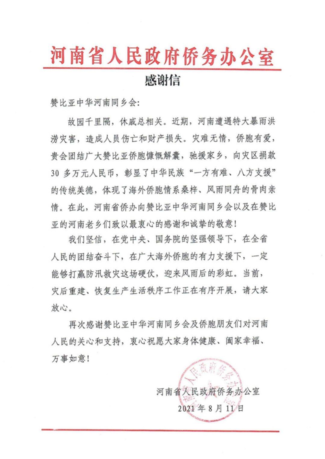 河南省人民政府侨务办公室和中国华文教育基金会分别向赞比亚中华河南同乡会暨商会发来感谢信,对商会及侨胞朋友们表达了最衷心的感谢和诚挚的敬意!