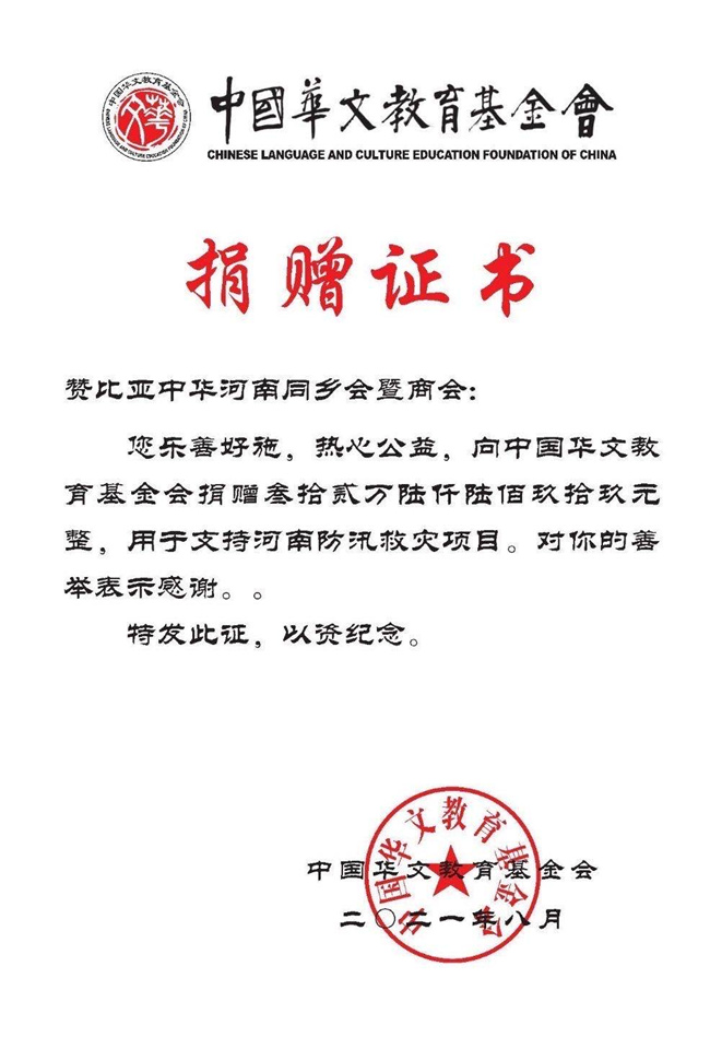 8月10日,在河南省人民政府侨务办公室霍鑫处长、庞振东副处长的指导下,赞比亚中华河南同乡会暨商会将筹集的善款全额转账到了中国华文教育基金会转款账号,捐款额是326699元人民币。计划捐赠地区为:郑州灾区捐赠126699元人民币、周口灾区捐赠100000元人民币、新乡灾区捐赠100000元人民币,用于各地市灾后教育设施的重建工作。