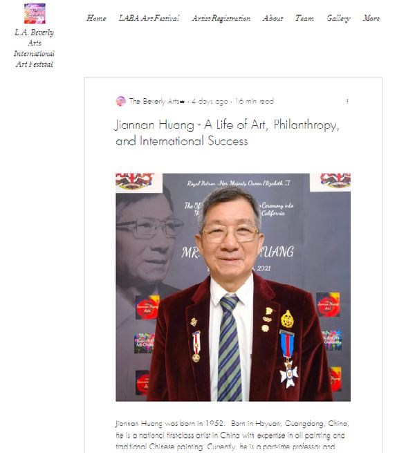 近日,比佛利艺术节官网以《黄建南——艺术、慈善和国际成功的一生》为题,对著名艺术家黄建南作了大篇幅的专题报道。文章在给予黄建南高度评价的同时,突出了黄建南独特的角色:既是“2021-2022LABA洛杉矶比佛利艺术节”第一位蓝筹股艺术家,又是英国皇家学会127年来第一位亚洲籍艺术家海外荣誉会员。