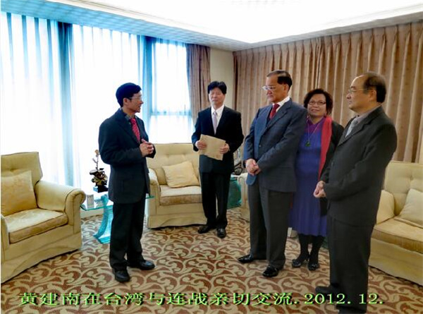2011年11月,黄建南应邀前往台湾并多次应邀赴台进行学术访问和文化交流,分别到前往台湾新竹玄奘大学、台中教育大学进行学术交流活动,作品被两所大学收藏。访问期间,应邀分别与台湾政坛领导国民党荣誉主席连战等中国台湾政坛人士进行亲切交谈……