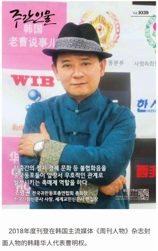 他是首次也是目前唯一刊登在韩国主流媒体《周刊人物》封面杂志上的在韩华人华侨。