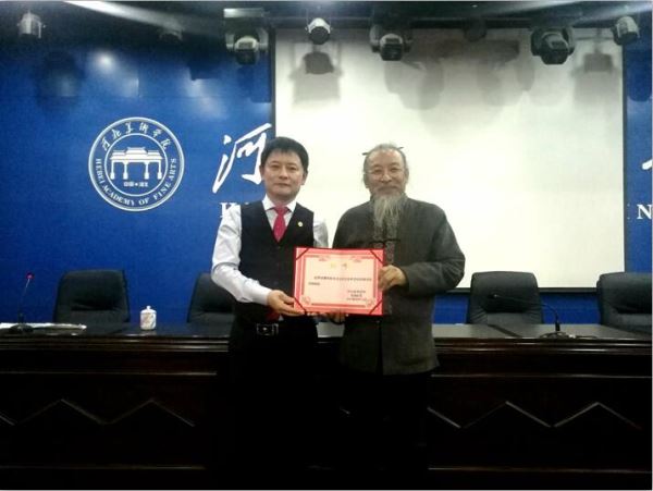 河北美术学院甄忠义(右)校长代表河北美术学院传媒学院,亲自为曹明权(左)先生颁发了终身教授聘用证书并共同合影留念。