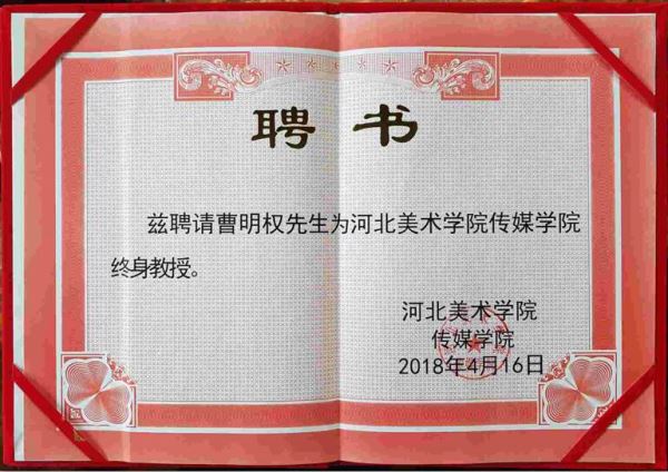 河北美术学院学院传媒学院为曹明权先生颁发的终身教授证书。