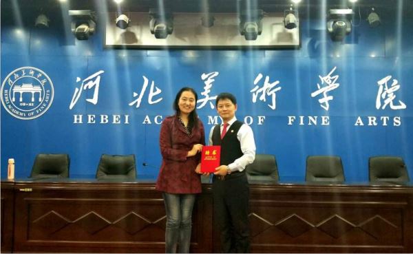 专题讲座及互动式活动结束后,河北美术学院甄忠义校长上台,代表河北美术学院传媒学院,亲自为曹明权先生颁发了终身教授聘用证书并共同合影留念。