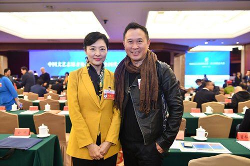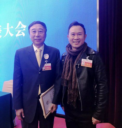 金波当选理事后与中国文艺志愿者协会第二届主席冯巩合影留念