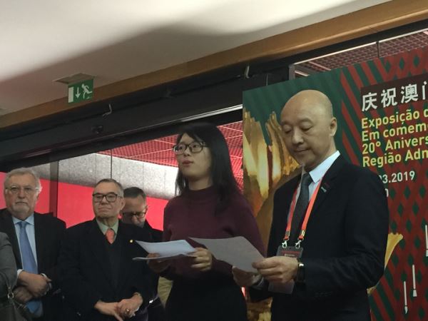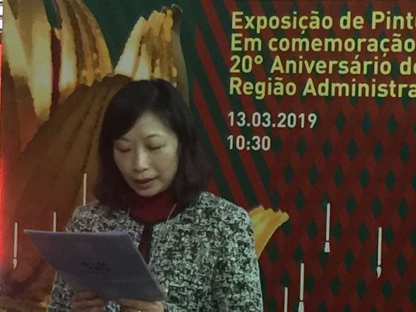 开幕式上,首先由澳门特区政府文化局局长穆欣欣女士致辞,“2019年是中葡建交40周年,以及澳门特别行政区成立20周年。希望通过画展的形式把澳门人民积极向上的生活方式带到里斯本。澳门特别行政区也设立了中葡文化交流中心,2018年第一次举办“相约澳门”中葡文化艺术节。相信随着中葡文化交流中心工作的不断深入,澳门与葡萄牙之间的文化交流定会不断加强。最后代表澳门特区政府文化局感谢澳门住里斯本经济贸易办事处的支持以及澳门美术协会的鼎力相助和会员的积极参与,让身在葡萄牙的观众能感受到澳门艺术家的创作热情和丰硕的艺术成果。”