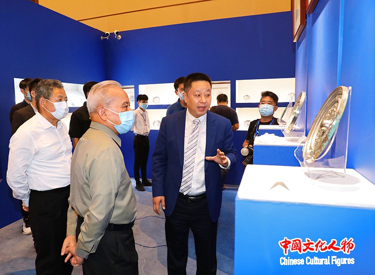 中国博物馆协会非国有博物馆专业委员会秘书长、中国民营文化产业商会副秘书长、大唐西市集团董事、副总裁、海南国际文化艺术品交易中心股份有限公司董事长王勇向十二届全国政协副主席、全国工商联原主席、国家电子政务专家委员会主任王钦敏,全国人大代表、中国民营文化产业商会会长、中国博物馆协会非国有博物馆专业委员会主任、大唐西市集团董事局主席吕建中介绍精美的珍品铜镜