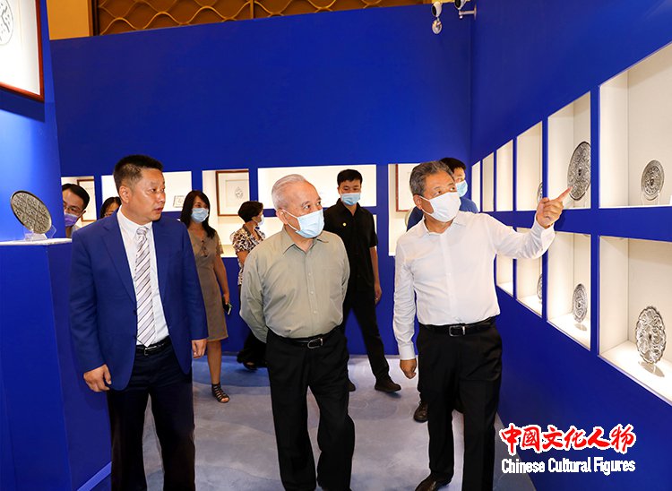 全国人大代表、中国民营文化产业商会会长、中国博物馆协会非国有博物馆专业委员会主任、大唐西市集团董事局主席吕建中向十二届全国政协副主席、全国工商联原主席、国家电子政务专家委员会主任王钦敏介绍各时期珍品铜镜的精美工艺