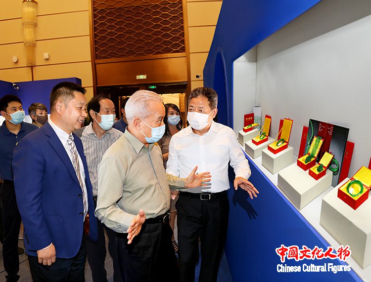 全国人大代表、中国民营文化产业商会会长、中国博物馆协会非国有博物馆专业委员会主任、大唐西市集团董事局主席吕建中向十二届全国政协副主席、全国工商联原主席、国家电子政务专家委员会主任王钦敏,国家文物局原局长刘玉珠介绍清代翡翠手镯、挂件等珍品,十二届全国政协副主席王钦敏对展品给予高度评价