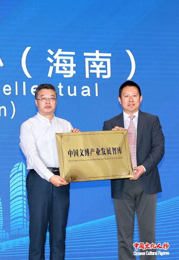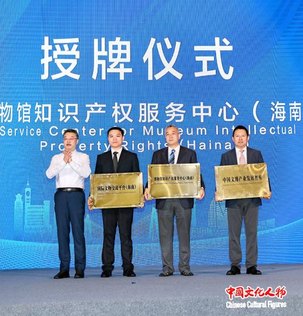 中国文物交流中心主任谭平为“国际文物交流平台(海南)”、“博物馆知识产权服务中心(海南)”和“中国文博产业发展智库”授牌