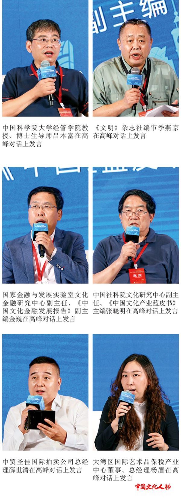 中国科学院大学经管学院教授、博士生导师吕本富,《文明》杂志社编审季燕京,国家金融与发展实验室文化金融研究中心副主任、《中国文化金融发展报告》副主编金巍,中国社科院文化研究中心副主任、《中国文化产业蓝皮书》主编张晓明,中贸圣佳国际拍卖公司总经理薛世清,大湾区国际艺术品保税产业中心董事、总经理杨眉分别在高峰对话上发言