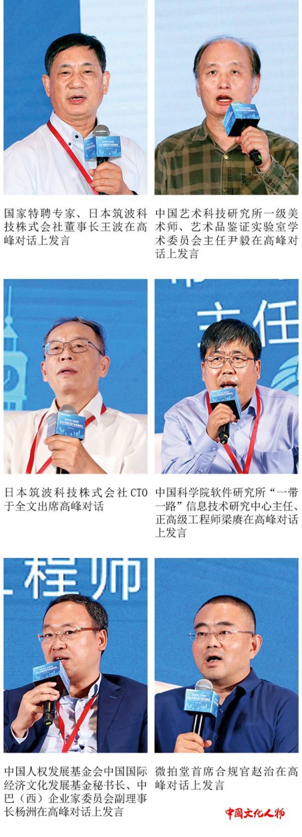 国家特聘专家、日本筑波科技株式会社董事长王波,日本筑波科技株式会社CTO于全文,中国艺术科技研究所一级美术师、艺术品鉴证实验室学术委员会主任尹毅,中国科学院软件研究所“一带一路”信息技术研究中心主任、正高级工程师梁赓,中国人权发展基金会中国国际经济文化发展基金秘书长、中巴(西)企业家委员会副理事长杨洲,微拍堂首席合规官赵治分别在高峰对话上发言