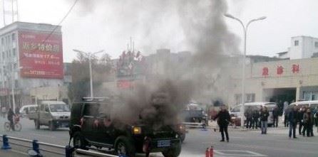 驾驶员见状,试图打开悍马车前引擎盖救火,但不知是温度太高,还是发生变形,车前引擎盖根本无法打开。此时,浓烟越来越大,蹿了几层楼高,呛人的烟味弥漫在街道。不少居民纷纷跑出家门。随后,悍马车头内蹿出明火。