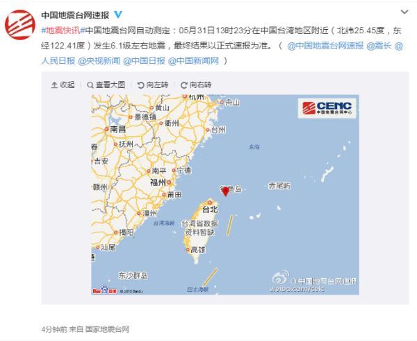 #地震快讯#中国地震台网自动测定:05月31日13时23分在中国台湾地区附近(北纬25.45度,东经122.41度)发生6.1级左右地震,深度228千米 ,最终结果以正式速报为准。