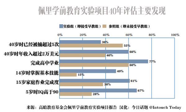 现象必有原因,我们只好借鉴国外的经验来说明。很多教育工作者都发现,进入小学之后,富孩子要聪明灵活得多,难道贫富鸿沟也造成了智力差距么?美国学者们在几十年前开启了探寻之路。1965年,一个叫作“佩里学前教育项目”的实验在美国密歇根州进行。参加实验者为123名低收入非裔家庭的儿童。学者们把他们随机分为两组,一组在3―4岁时接受学前教育,另一组则“放养”。然后他们等孩子慢慢、慢慢长大,隔几年回访一下。一路比较到40岁,结果太惊人――不管在教育程度、收入水平还是人生境遇上,受过学前教育的这一组都是活脱脱的“人生赢家”,碾压后者。尤其值得注意的是,在犯罪率上,受过学前教育的这一组也要低得多。如下图: