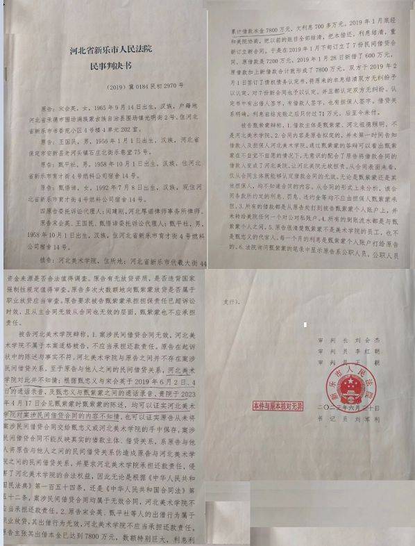 河北美院负责人称:这本来是正常的民间借贷,经过出借人的精心策划和甄某蒙的配合,最后演变成了河北美院为借款人,出借人以不实的合同,起诉到法院,以胜诉来达到侵吞河北美院之目的。这是一起有预谋,有计划名义上假借民间借贷,实则是虚假诉讼系列诈骗案。