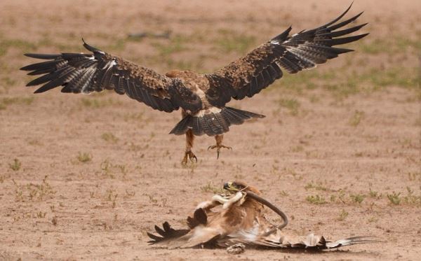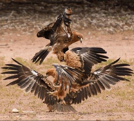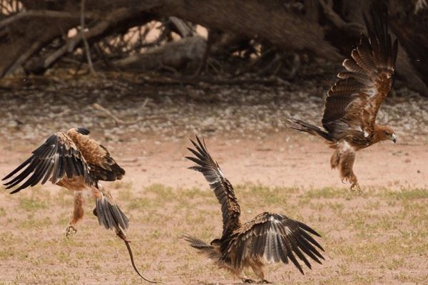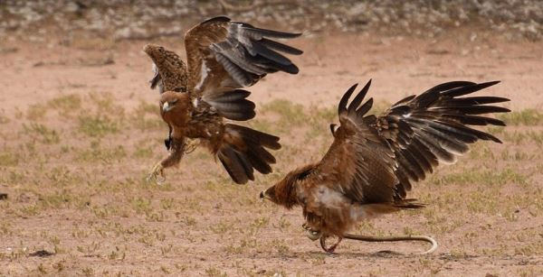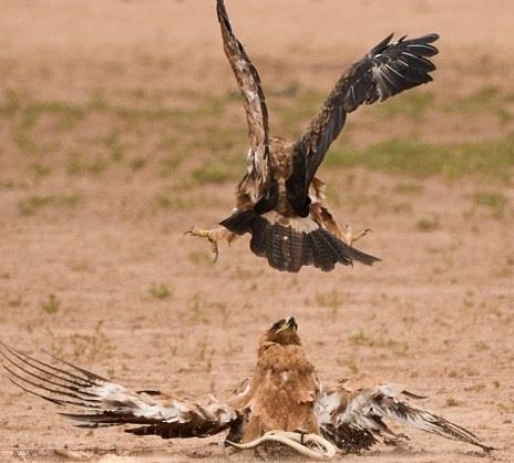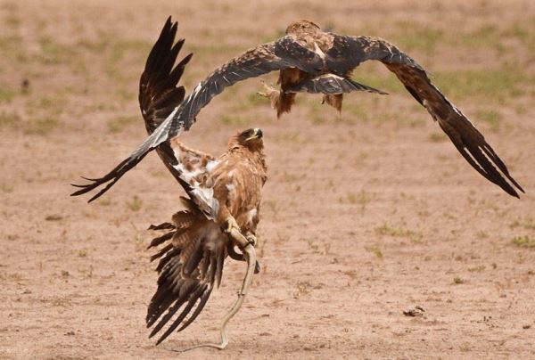 从这组照片可以了解这场“争斗”的大致过程。茶色的鹰首先确立了对眼镜蛇的“所属权”,可在即将飞离时遭到了其它两只鹰的争夺。它们不断地变换进攻姿势,可都枉费力气。茶色的鹰俯冲到地面,将眼镜蛇牢牢攥在自己爪中。最终,这只鹰飞向天空,其它两只仍然穷追不舍,继续在空中展开争夺战,真可谓“有勇有谋”。