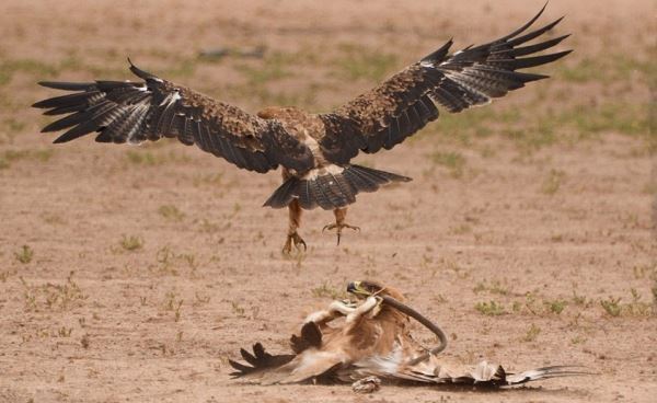 非洲三雄鹰为捕食眼镜蛇上演争夺战