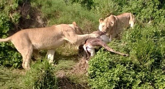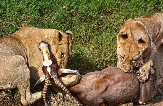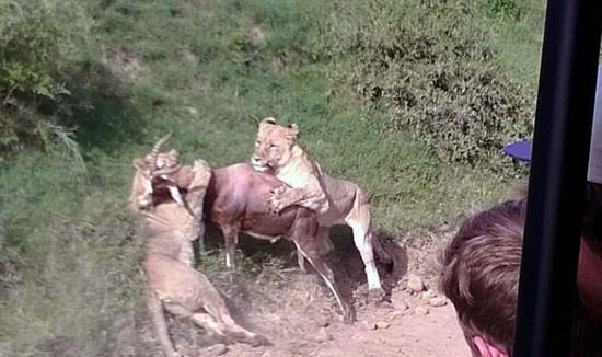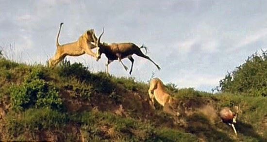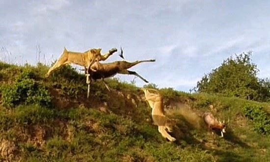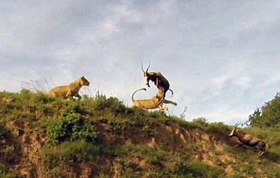 起初,两只母狮子在山脊上隐藏着,突然惊讶地发现有两只羚羊朝着它们的方向跑来,为了逃命,一只受了惊吓的羚羊在山脊上腾空跳跃了几米高,想要避过狮子,但是没想到被饥饿的母狮从空中截获,成了狮子的美餐,另一只羚羊则趁机逃走。