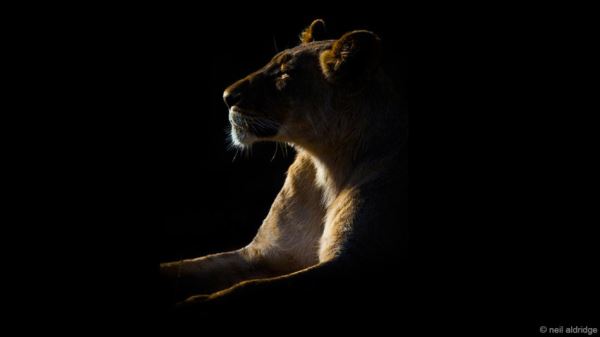 南非卡里埃加狩猎保护区,一头沐浴在暮光中的母狮。阿尔德雷吉数次与这头母狮相遇,他注意到这头母狮似乎独来独往,并不与狮群中的其他成员来往。沐浴在清晨的第一缕阳光中,这头母狮似乎对一头附近的犀牛和它的幼崽产生了兴趣。
