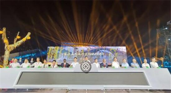 与会领导和重要嘉宾手按象征大运河“世界遗产”标志启动本届运博会