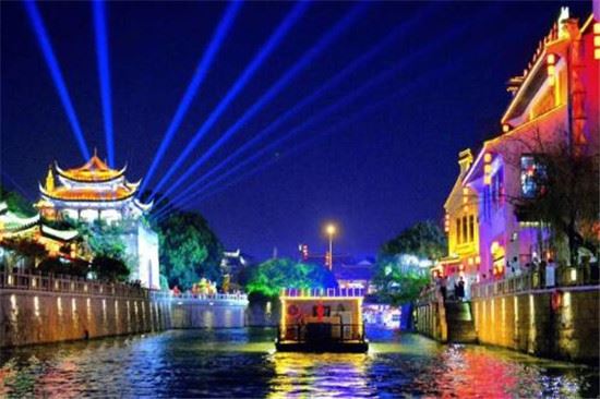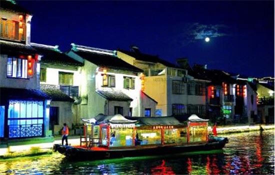 开幕式前中外嘉宾乘坐江南画舫夜游运河,欣赏古运河秀美多姿的夜色美景,观看运河两岸缤纷多彩的实景演出。
