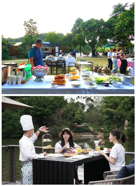湖畔烤吧:由14个林间烧烤炉组成,可以进行森林中的户外烧烤、同学聚会等系列团建活动。湖内养有草鱼、罗非等鱼类,客人可以享受垂钓的乐趣。对面就是幸福共享中心,可以举办餐饮、会务、私人PATY等活动。