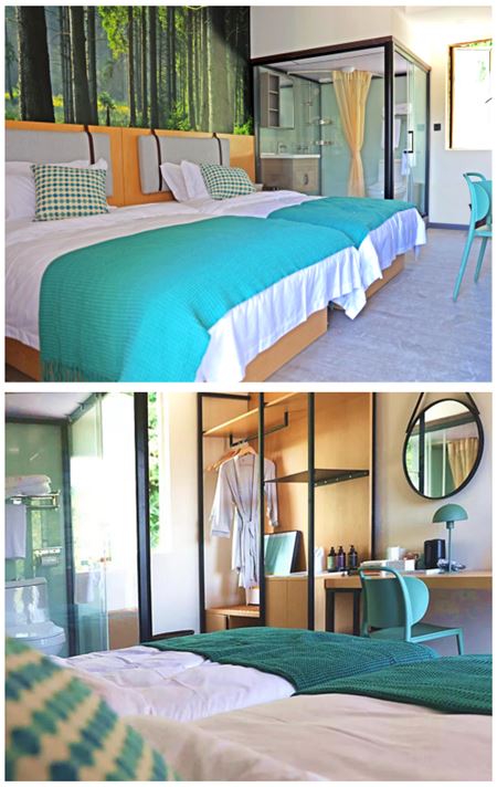 森林木舍:位于项目停车场,交通便利,共有25间客房,分为大床房、双床房和三床房。森林木舍室内装修以年轻人喜欢的蓝白清爽色调为主,简单明亮,充满时代感。
