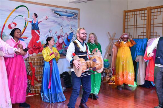 外籍友人体验朝鲜族舞蹈。梁琪佳摄