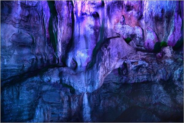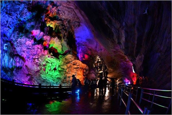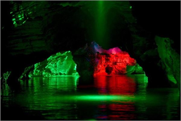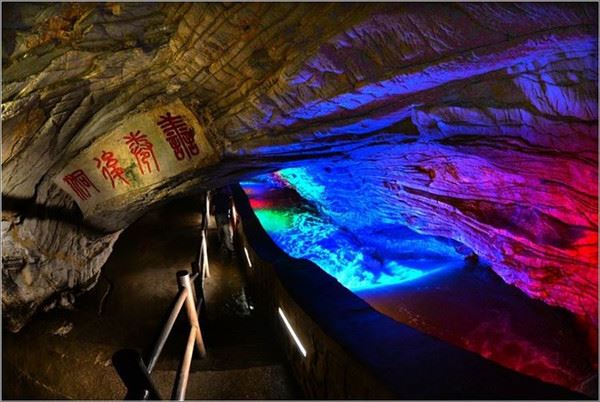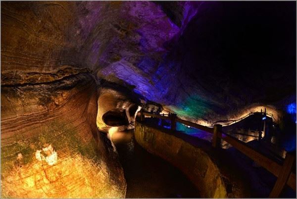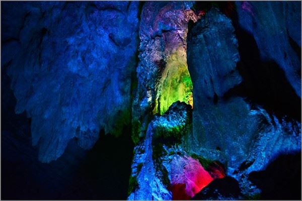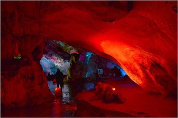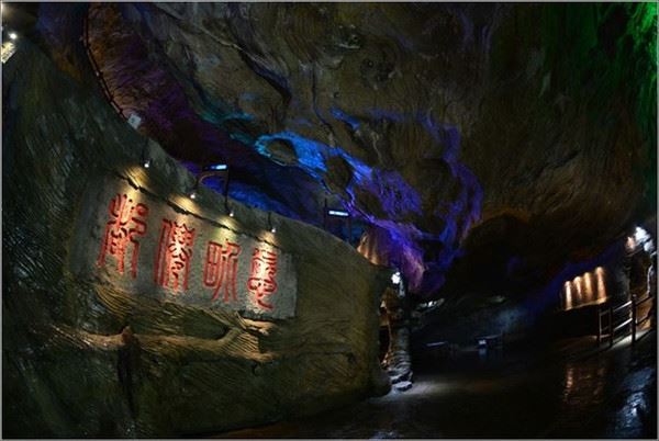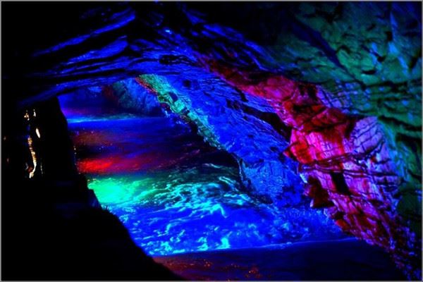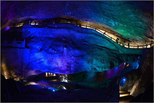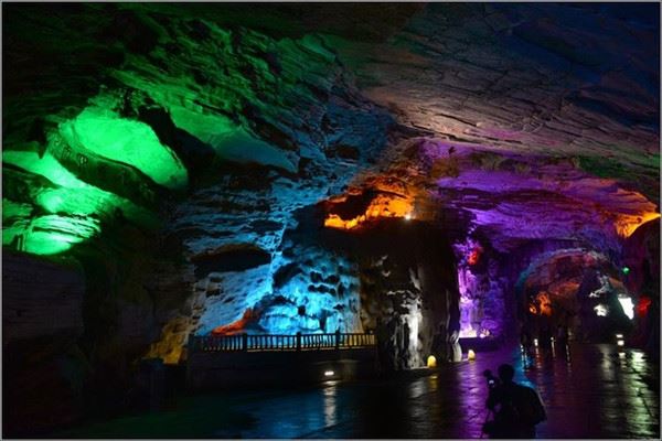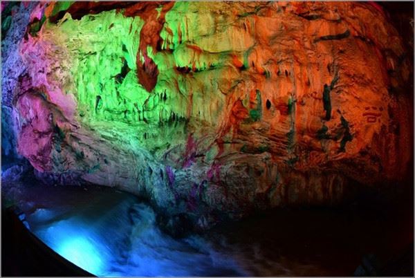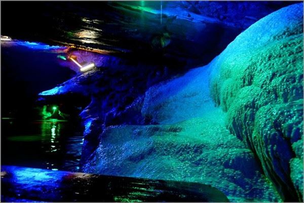 洞口回折即到了水洞,长约120米,水深4米多,石道边上的明渠里水流奔腾,发出巨大的吼声,五颜六色彩灯的照射下,如入幻境。