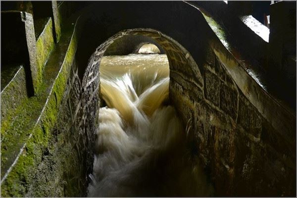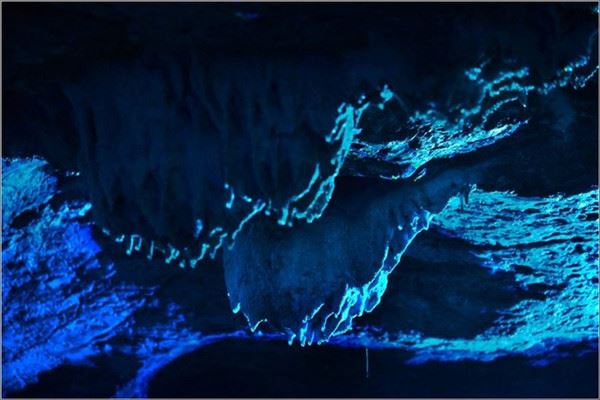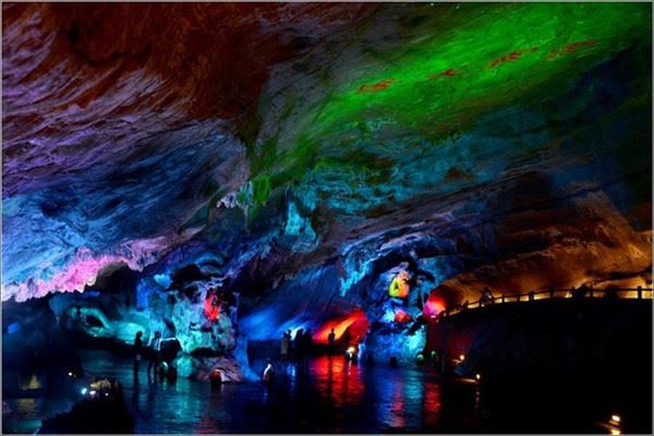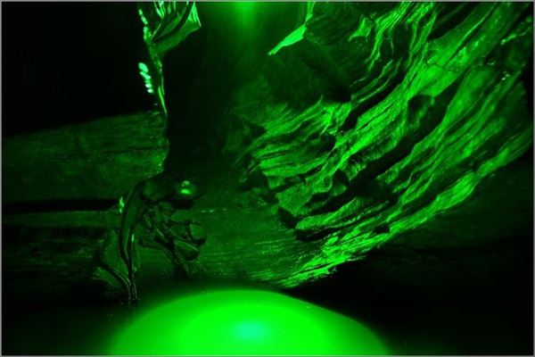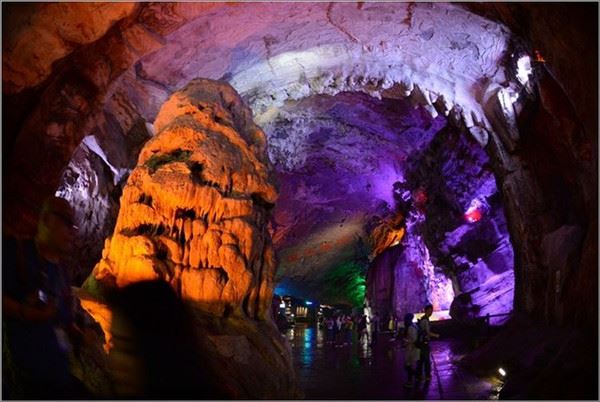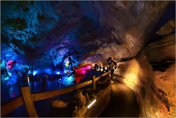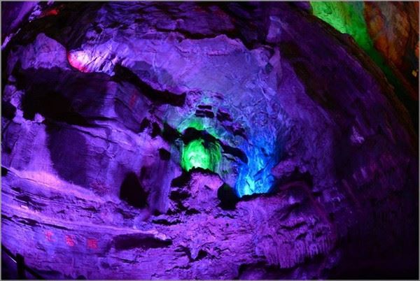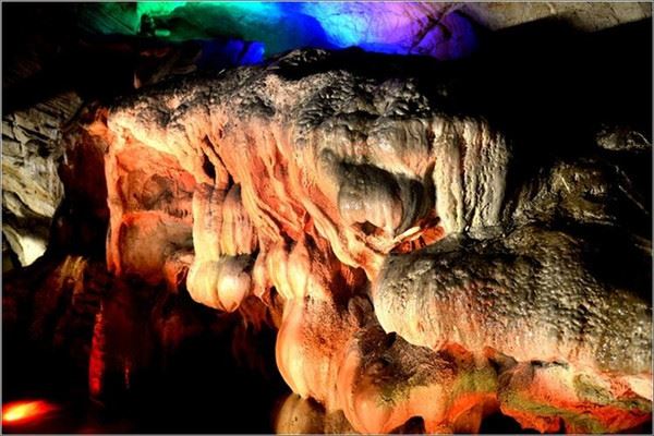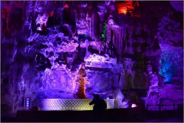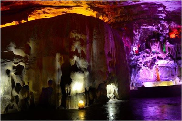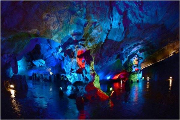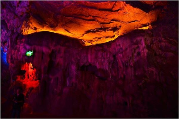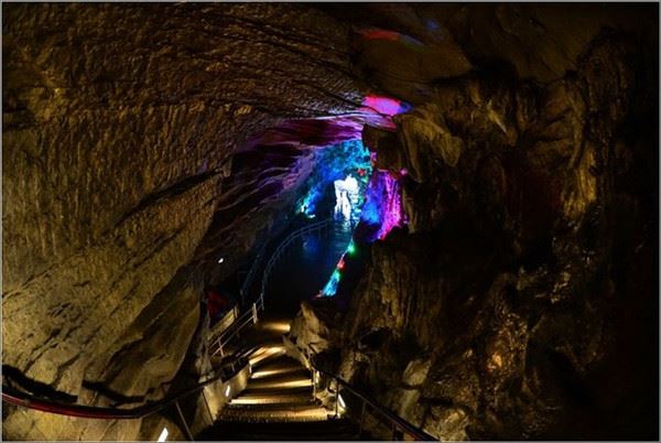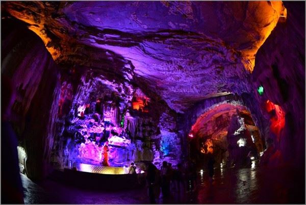 洞口回折即到了水洞,长约120米,水深4米多,石道边上的明渠里水流奔腾,发出巨大的吼声,五颜六色彩灯的照射下,如入幻境。