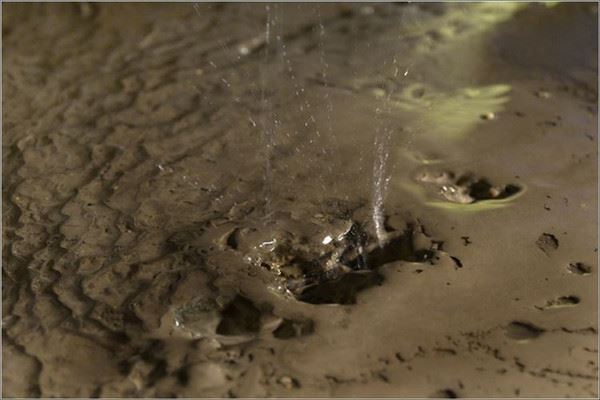 洞顶淅淅沥沥的滴下水滴,水滴所至处的地面结下了一层“石膜”,可见水中碳酸钙含量十足。