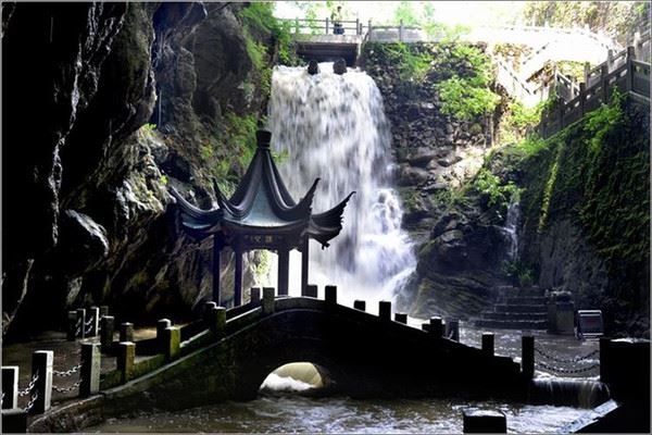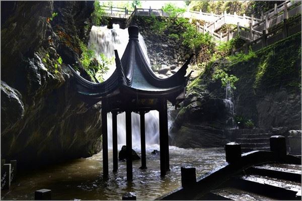 下洞洞天相接,日前一场暴雨使悬崖上的飞瀑更旺,从崖端直泻下洞,经小桥渠道引导归赴水洞。