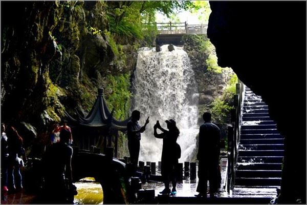 还没进入下洞呢,听得下洞的水流冲泻声、瀑布轰鸣声震耳欲聋,游人仿佛置身于金鼓齐鸣、风雷交加、万马奔腾的境地。
