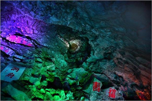 水洞内的崖壁上,刻着福、寿等吉祥字样,“洞府”下面是一棵千年古松,里面矗立的是“善卷”老人,你看出来了吗?