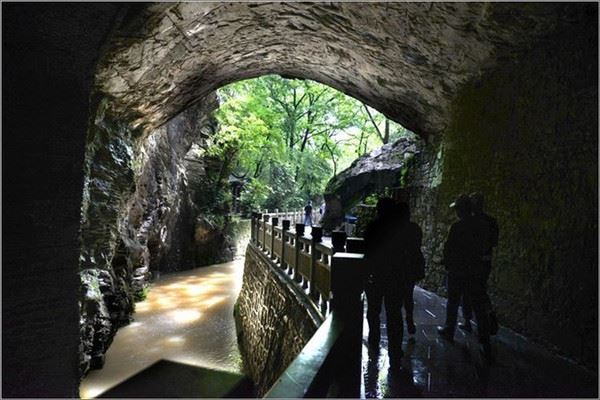 水洞尽处光明突现,顿觉“豁然开朗”,弃舟登岸,沿绿荫小溪入“祝英台读书处”。