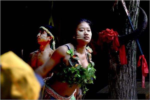 “野人”姑娘小伙跳了起来,那近乎原始的舞蹈反映了当年深山中的少数民族生活生产和娱乐的情况。
