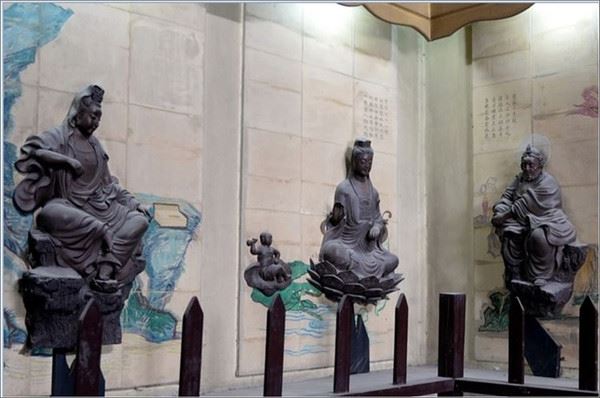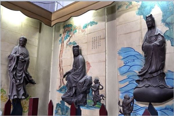 最著名的是这堪称世界一绝的53尊紫砂全雕观音菩萨,栩栩如生,把宜兴特产紫砂工艺运用到佛界中,颇有创意。