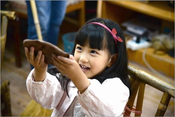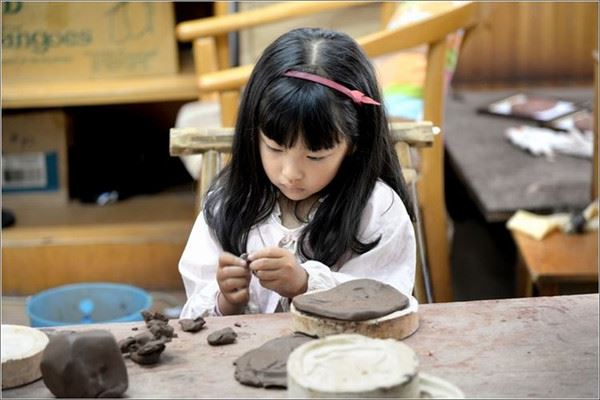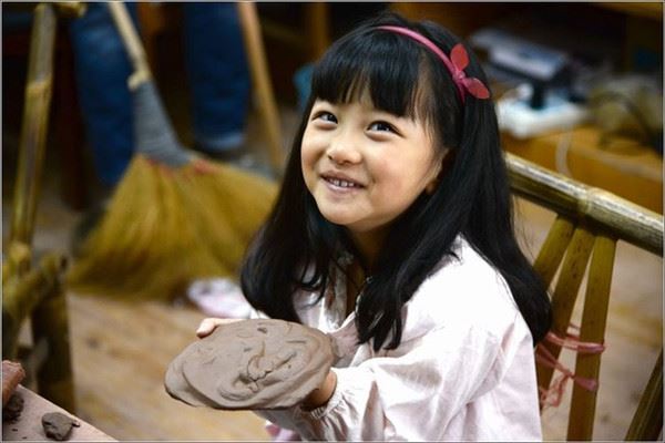 这可爱的小女孩看来是陶吧的老顾客了,专注的创作着自己的作品。