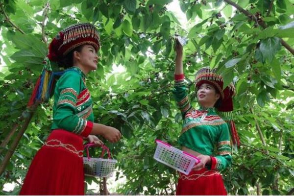 中新网四川新闻4月9日电 (刘婷 邹立杨)“这颗樱桃好红,让我拍一个。”“这里的桑椹好甜啊!”在9日的德昌桑椹、樱桃采摘品鉴体验活动上,来自全国各地的游客在乐跃镇和德州镇角半村的田间地头体验了一把采摘的乐趣,并争相和美丽的傈僳族姑娘合影留念。