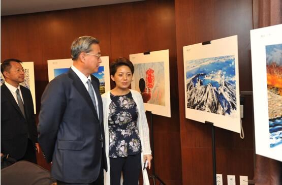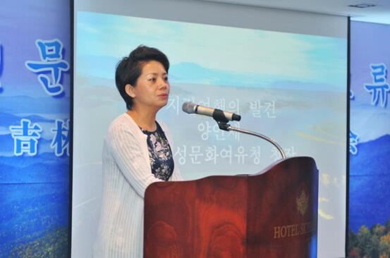 吉林省文化和旅游厅厅长杨安娣向中国驻韩国大使馆公使王鲁新介绍吉林省文旅产品