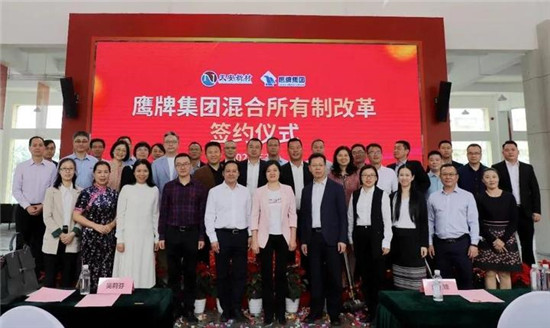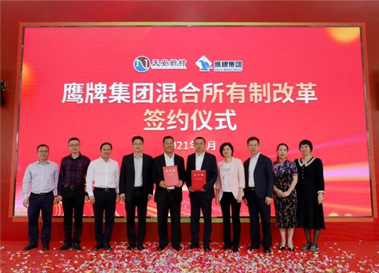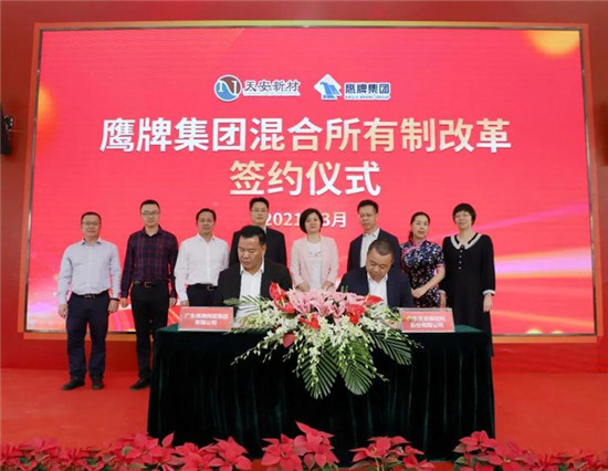 3月16日,广东鹰牌陶瓷集团有限公司(以下简称“鹰牌集团”)混合所有制改革签约仪式在佛山市鹰创园隆重举行。仪式上,鹰牌集团与广东天安新材料股份有限公司(以下简称“天安新材”)签订《产权交易合同》,鹰牌集团将其持有的四家子公司(即佛山石湾鹰牌陶瓷有限公司、河源市东源鹰牌陶瓷有限公司、佛山鹰牌科技有限公司、佛山鹰牌陶瓷贸易有限公司)各66%股权引入民营资本——天安新材,共同推动鹰牌集团混合所有制改革。