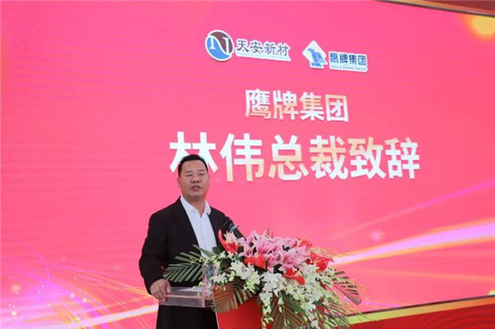 仪式上,鹰牌集团总裁林伟首先致辞。他表示,作为石湾镇街道下属企业,在街道的领导下,鹰牌集团多年来始终坚持规范、稳健经营,坚持品牌路线,坚守品质经营,坚持匠心和创新,整合泛家居产业资源,探索新的商业模式。近年来,随着国内经济大潮变革和行业洗牌整合的压力加剧,鹰牌集团原有的管理体制机制无法迅速适应日益激烈的市场竞争。为了让鹰牌得到更好的发展,禅城区和石湾镇街道两级政府不遗余力地推动鹰牌的混改。经过多年的不懈努力,最终引入了天安新材。