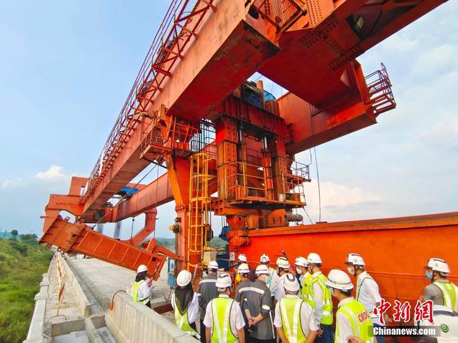 当地时间10月16日,随着最后一榀重达900吨的简支梁稳稳落在雅万高铁24号桥8号至9号桥墩上,印尼雅万高铁全线箱梁架设任务全部完成,铺轨通道全面打通,为2023年6月建成通车奠定了坚实基础。图为架梁现场。 中新社发 陶塬羽 摄