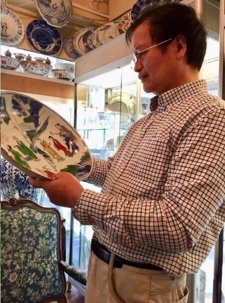 洪加祥在伦敦古玩店挑选康熙五彩人物盘。